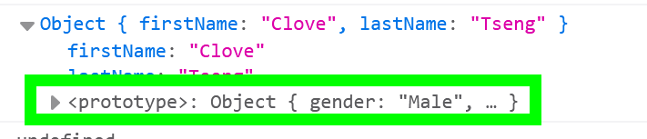 在 DevTools 看到除了 firstName 跟 lastName 的值之外,可以看到下面還有一個 prototype chain 的物件,裡面就會包含寫入的 gender: "Male"